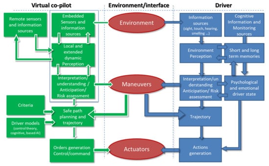 The Decision-support framework presented in this paper is based on the concept of “virtual Co-Pilot” developed over the past few years at Gustave Eiffel University (see Appendix A). As part of a European project (HAVEit []) and a French project (ABV []), some components needed for the design of a virtual Co-Pilot framework involving the perception, decision, path planning, and control modules have been developed at Gustave Eiffel University [] as a highly automated driving delegation application shared with a human driver for Highway situations. This optimal path planning application (minimization of a set of criteria including risk) tackled a multi-constrained problem. In terms of general architecture, the functions developed for the virtual Co-Pilot are very similar to human operations and behaviours (see Figure 2).