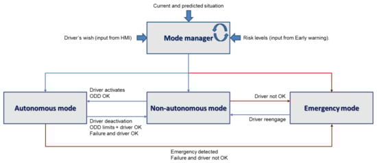 - This component decides which driving mode should be adopted, depending on the current and short time predicted situations, the driver’s wish (input from HMI), and the combination of the different risk levels (input from Early warning). The ODD establishes conditions under which the vehicle may operate in autonomous mode. The Mode manager is also responsible for starting the emergency mode and issuing a request to intervene to the human driver.