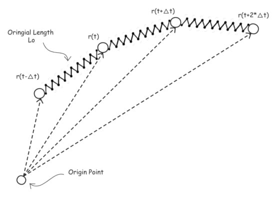 where (resp. ) is the contraction force from the previous (resp. next) trajectory point. The spring original length and coefficient are free parameters. Since the internal force of the trajectory node is only calculated based on the neighbouring nodes in the classic algorithm, the state of the previous time step does not have any influence on the current time step, which is not able to satisfy a continuous and dynamic process in the trajectory planning. Considering this limitation of the classic algorithm, we redefine the internal force as shown in Equation (3):