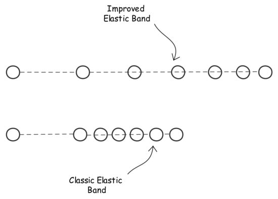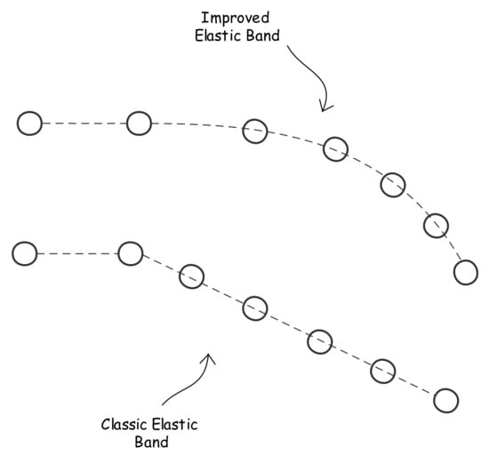 The general Elastic Bands method simulates a trajectory through a series of nodes representing the positions of the vehicle, at different times t in the immediate future. Usually, each pair of consecutive trajectory nodes is linked by a spring so that they stay at a relatively constant distance from each other (see Figure 5). The total contraction force applied to node t is computed as shown in Equations (1) and (2):