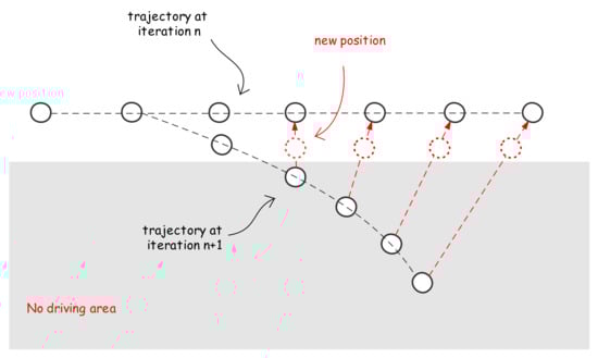 One problem occurs when second-order computation is employed, the trajectory node may go into the non-driving area (inside the obstacle, out of boundary) due to a large displacement. In order to solve this problem, we added a new computation (see Equation (10)) at each iteration in this area, as shown in the Figure 10. When the trajectory node is detected at the non-driving area at iterations , the possible biggest is chosen to ensure that the new position is in the driving area, and it is determined with the value of 0 can still work in the worst case. In addition, is 1 for the nodes that are already in the driving area.