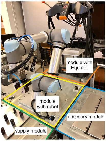 For our study, we used an adaptive robotic cell (ARC) for automated SPC dimensional measurements developed in our laboratory in collaboration with the company Kolektor. The whole robotic cell consists of five modules, a module with a robot, a module with the Equator, a module for optical inspections, an accessory module with a storage area, and a module for the supply of subjects on measuring pallets. The ARC, therefore, makes possible contact and non-contact dimensional measurements. For our research, a subset of a module with a robot, a supply module, and a module with the Equator were used (Figure 2). The immediate observation was that the robot manipulation has a more significant influence on the variance of contact dimensional measurements than the non-contact dimensional measurements; therefore, non-contact methods were off the study.