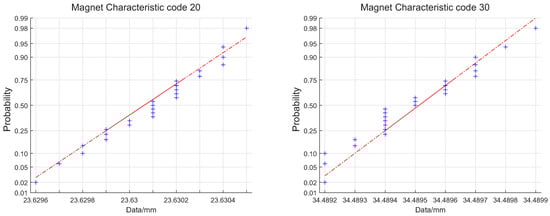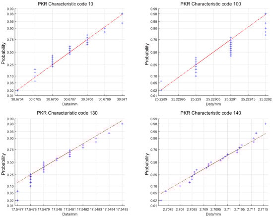 We confirmed the normal distribution of the measured data for all measured characteristic codes for both measured objects using Anderson Darling normality test [39] with confidence level. Anderson Darling normality test rejects the hypothesis of normality when the p-value is less than or equal to . Corresponding statistical p-values for all characteristic codes for scenario 1 and scenario 9 are greater than and are gathered in Table 3. Additionally, Figure 6 shows the normal probability plot, respectively, of characteristic codes 20 and 30 for a Magnet object, and Figure 7 shows the normal probability plot, respectively, of characteristic codes 10, 100, 130, and 140 for PKR object.