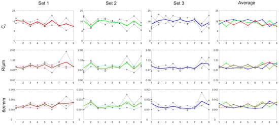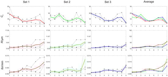 Figure 8 and Figure 9 present the measurement data calculated by the MSA type-1 analysis separately for the characteristic codes 20 and 30 for the object Magnet. The first row represents the capability factor , the second row depicts the range of measurements R, and the third row shows the values. The columns represent the individual measurement sets: the first column measurement set 1, the second column measurement set 2, and the third column measurement set 3. In contrast, the last column shows only the average values of the individual sets on a common graph. The red color represents the average values of set 1, the green color represents the average values of set 2, and the blue color represents the average measurements of set 3. The black dotted lines represent individual repetitions of a particular set of measurements. The absolute value of statistical parameters (, R, and ) is not as significant as the decreasing/increasing trend.