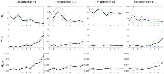 Figure 10 shows the measurement data calculated for the MSA type-1 analysis for the characteristic codes 10, 100, 130 and 140 for the object PKR. The first row represents the capability factor , the second row shows the range of measurements R, and the third row shows the values. The first column represents the measurements of the characteristic code 10, the second column represents the measurements of the characteristic code 100, the third column represents the measurements of the characteristic code 130, and the fourth column represents the measurements of the characteristic code 140. The red, green, and blue lines represent the individual measurements, while the black lines represent the average measurement values. The absolute value of statistical parameters (, R, and ) is not as significant as the decreasing/increasing trend.