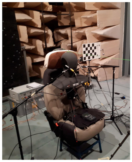 Semi-anechoic chamber at CIRA: the setup consists of a dummy seat with binaural head and configurable headrest.