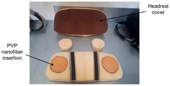 In the current investigation, cylindrical insertions made with several layers of PVP nanofiber textiles were embedded in the caps of the dummy headrest, see Figure 3. Different configurations for the headrest were considered to evaluate the impact of the nanofiber insertions and of the headrest shape.