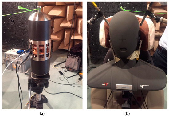 (a) Calibrated monopolar volume velocity source (Simcenter Qsource) and (b) binaural head (HEAD Acoustics HMS) adopted for the tests.