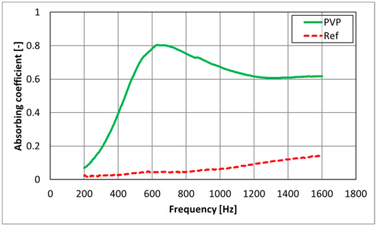 The mesh presented an average element size of nearly 15 mm that guaranteed about 15 nodes per wavelength at a frequency of 1600 Hz. It is a common practice to guarantee at least 4 to 8 nodes per wavelength to consider a mesh as sufficiently fine and, therefore, no convergence study was considered as required here. Simulations were performed up to 1600 Hz due to the availability of material data only up to that frequency (Figure 10). The monopole source was set up in such a way to emit the same power spectrum as in the experiments (Figure 6). The BEM fluid was air, with a sound speed equal to 343 m/s and mass density equal to 1.21 kg/m3. A null damping loss factor was assumed in air. The two circular insertions were modelled either having an area impedance corresponding to a traditional reference material or, alternatively, having the nanofiber textile impedance. PVP nanofiber textile and reference absorbing coefficients are shown in Figure 10. Such data were measured with a Kundt’s tube [17,18,19].