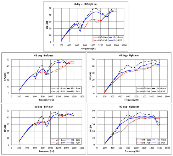 Numerical results in terms of SPL spectra for different headrest’s configurations. Monopole source at a distance equal to 75 cm. “PVP” or “Base” refer to the configurations with or without the PVP + silica nanofibrous insertions in the caps.