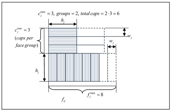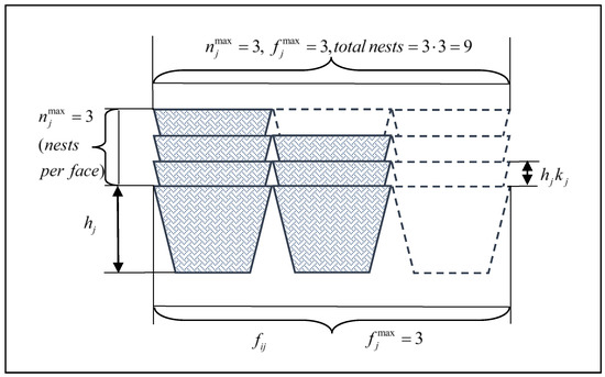 Figure 1 and Figure 2 present the general idea behind cappings and nestings allocation methods. Products can be capped (i.e., placed one on the top of the other in another rotated orientation, Figure 1) or nested (i.e., placed one inside the other, Figure 2) or neither. Thus, denotes the nesting coefficient for the product, which indicates additional height for one nested item (e.g., the extra bucket height if buckets are placed inside each other). For products that cannot be nested .