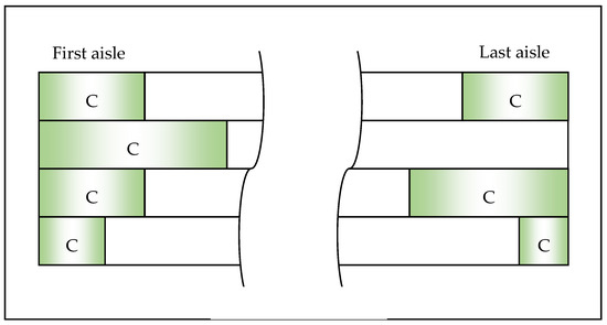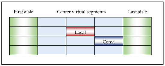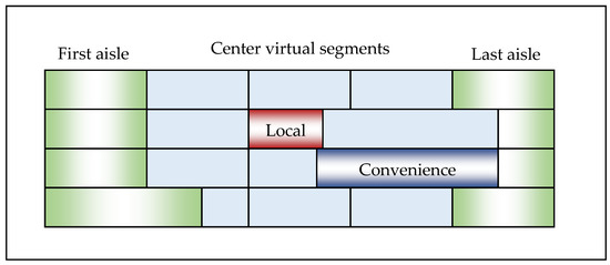 Figure 6 presents the possibilities for extending and reducing the first and the last aisle virtual segments. If the product must be placed in the first aisle, the centre coordinate of a product is inside the first virtual segment on the shelf, characterized by coordinates . Otherwise, if the product must be placed in the last aisle, the centre coordinate of the product is inside the last virtual segment on the shelf, characterized by coordinates . Figure 6 also demonstrates a shelf without special products assigned to the last aisle SVS. A similar situation may exist with other SVS types (local, convenience, shelf centre, first aisle) if there are not enough special products or are assigned to other shelves.