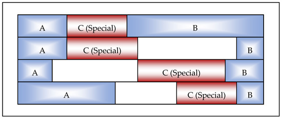 In this research, we use SVS to refer to the Special Virtual Segment of any local, convenience, centre, or aisle virtual segments. The product is unique if it is marked at least by one of the product properties: , , , , . To solve task of the correct product placement into the SVS, we define the type () for every kind of virtual segment constraint according to the horizontal position on the shelf. There are five possible product types on the shelves: local product (), convenience product (), shelf centre product (), first aisle product (), and last aisle product (). On each type , we divide the number of products into three subsets on each shelf: subset A is before the SVS, subset C is inside the SVS, subset B is after the SVS. For example, is a subset for the products allocated in the first or last aisle SVS and marked as special products. Other products (not special ones) may be allocated to the subsets with no restrictions. Thus, binary decision variable indicates if the product belongs to the appropriate type () of the subset () on the shelf .