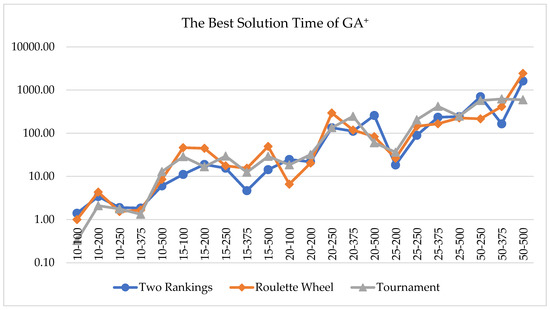 Figure 9 demonstrates the average time for GA+. All GAs+ found the solution on average approximately 2–3 min. The fastest solution was found in 0.01–0.02 min and the slowest one in 27.15 min by GA+ with Two Rankings, 40.63 min by GA+ with Roulette Wheel and 42.74 by GA+ with Tournament.