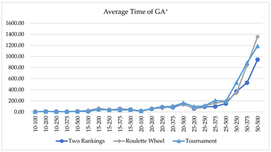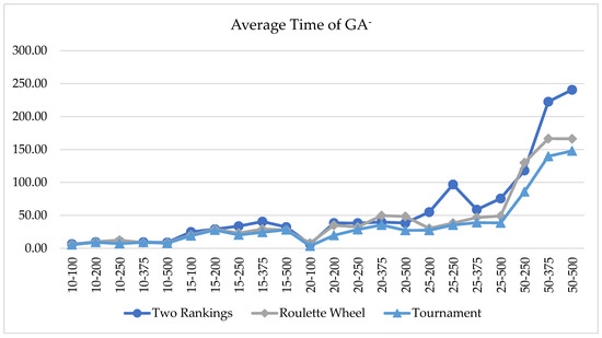 Figure 11 demonstrates the average time for GA−. All GAs+ found the solution, on average, in less than 1 min. The fastest solution was found in less than 1 s and the slowest in 6.92 min by GA+ with Two Rankings, 5.17 min by GA+ with Roulette Wheel, and 4.33 min by GA+ with Tournament. It is significantly faster than GA+.