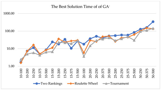 Figure 10 shows the computational time for the best solution of GA−. GA− with Tournament was the fastest, and the solution on average in 0.56 min. The minimum time for all GAs− was 0.03–0.04 min. The maximum time was approximately 2.5 min for both GA− with Roulette Wheel and GA− with Tournament, and 5.71 min for GA− with Two Rankings. All GAs− on average found the solution in less than 1 min.