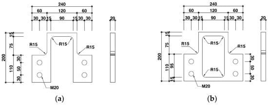 Steel damper used in specimens (unit: mm): (a) SD1; (b) SD2.
