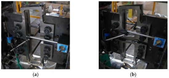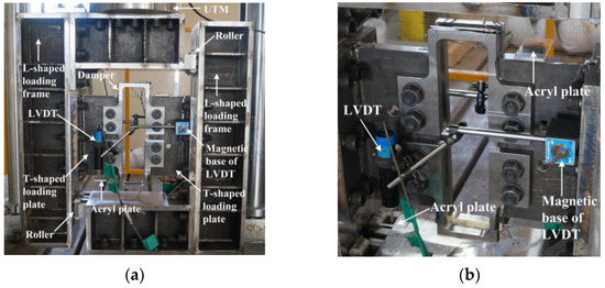 Figure 2 shows the test setup of the Phase I test specimen. The damper was bolted to the T-shaped steel plate for load transmission located on the left and right sides. In turn, this plate was bolted to each of the two L-shaped load frames. One of the L-shaped load frames was fastened with a 2000 kN universal testing machine (UTM) on the top and the other was fastened with the steel frame on the bottom. Rollers were installed in the upper and lower parts where the L-shaped frame meets to apply a shear force to the specimen in the vertical direction.