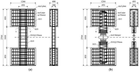 As shown in Figure 3, Specimens M1 and M2 without and with the proposed damper, respectively, were designed for the Phase II test. The specimens had stiff stubs at both ends to realize relatively high rigidity compared to that of the coupling beam because many reinforcing bars are placed in the shear wall to withstand the lateral and axial forces. The beam of the specimen had a width, height, and length of 200 mm, 450 mm, and 1000 mm, respectively. Furthermore, the stub has a cross section of 400 × 850 mm2 and length of 1200 mm.