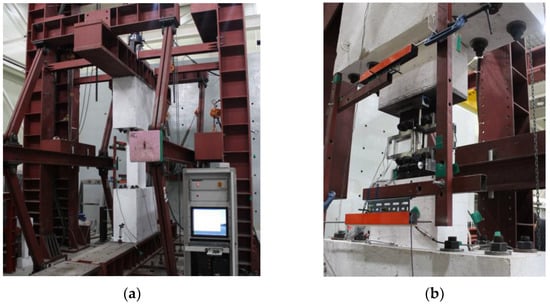 In order to evaluate the applicability of the proposed damper to structural members, an antisymmetric moment due to seismic loads was designed to act on the specimen. Figure 4 shows the test setup of the Phase II test specimen. The antisymmetric moment was implemented using a horizontal holding device. The lateral load was applied to the specimen using an electric actuator with a capacity of 1000 kN that was installed at the mid-height of the specimen. The lateral load actuator was bolted to the loading frame connected to the specimen. In order to simulate the damper resisting the shear force induced by the lateral load caused by the earthquake, a 1000 kN hydraulic actuator connected to the upper part of the load frame was used to prevent axial force from acting on the specimen.