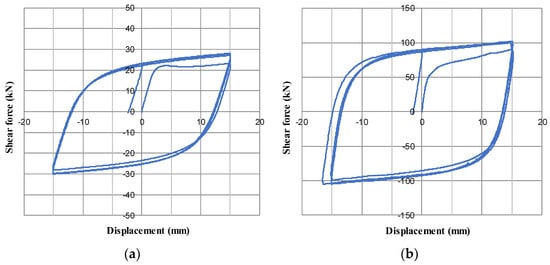 The shear force-displacement curve obtained from the Phase I test is shown in Figure 5. Specimens D1 and D2 showed stable elasticity and plastic behavior up to the target displacement of ±15 mm. As shown in Table 2, D1 first yielded in the first cycle at a displacement of 1.85 mm and load of 18.1 kN. By contrast, D2, with an additional lower horizontal member, first yielded in the first cycle at a displacement of 0.57 mm and a load of 36 kN. In other words, D2 had 6.4 times higher rigidity than D1 owing to the addition of the lower horizontal member. This means that a damper with higher initial rigidity can dissipate external energy more quickly when the external load is transmitted to the structure.