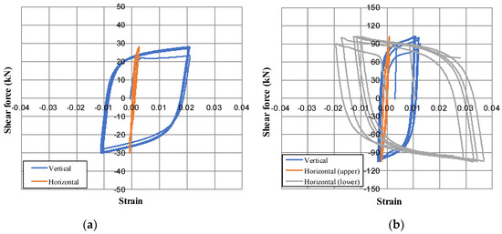 As shown in Figure 7, D1 has a maximum strain of approximately 0.021 in the vertical member. At both ends of the horizontal member, it was deformed to a maximum strain of 0.0018. D2 showed maximum deformations of 0.05 in the lower horizontal member, 0.02 in the vertical member, and 0.0022 in the upper horizontal member. These experimental results reveal that in D1, most energy is dissipated in the vertical member, whereas in D2, most energy is dissipated in the lower horizontal member as well as the vertical member.