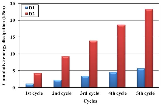 Figure 8 shows the cumulative energy dissipation area of D1 and D2 for each cycle. In the first cycle, D1 showed an area of 1050.6 kN·mm, whereas D2 showed an area of 4235.9 kN·mm (i.e., around four times higher). A similar trend was seen in all five cycles. In the fifth cycle, the energy dissipation areas of D1 and D2 increased by approximately 10% compared to those in the first cycle. The accumulated energy dissipation of D1 and D2 during the five cycles was 5650.2 and 23,262.1 kN·mm, respectively. In addition, the energy dissipation area did not decrease from the first to the fifth cycles in all specimens. These experimental results confirmed that the proposed R-type steel damper has high load resistance capability and very good energy dissipation capability.