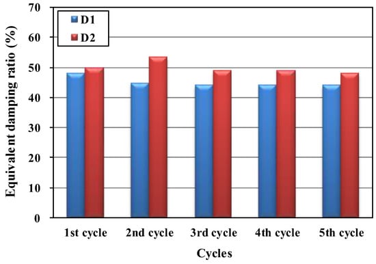 where is the internal area of the first cycle history of the specimen and is the maximum strain energy; they are obtained as shown in Figure 9. Furthermore, Figure 10 shows the result calculated using Equation (1). D1 and D2 showed high equivalent attenuation ratios of 44% ~ 48% and 48.1% ~ 53.4%, respectively, and these values are close to the ideal case of elastic–plastic behavior. It can be confirmed that the proposed R-type damper maintained a high damping capacity through the vertical and upper horizontal members and had high load resistance capability through the addition of the lower horizontal members.