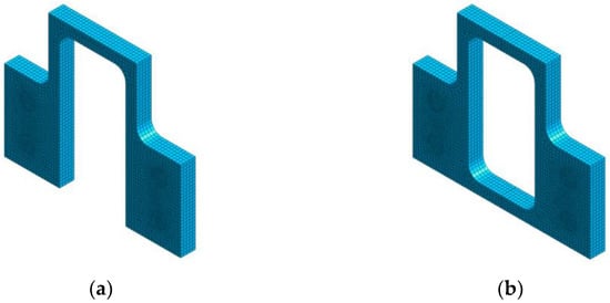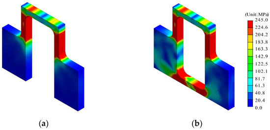 Figure 11 shows the FE analysis modeling of the damper used in the Phase I test. A 3D solid hexahedron element with a size of approximately 4 mm was used to model the steel damper. In order to induce a shear force, the bolted part of one steel plate was fixed and then a displacement was induced in the bolted part so that the other steel plate was moved only in the vertical direction. Figure 12 shows the stress distribution when the target displacement is reached; the red color indicates that the yield stress has been reached. As in the experiment, no buckling was found. The FE analytical results in Figure 12 and the experimental results were similar in the region where the yielding occurred. In other words, most energy dissipation of the angled U-shaped D1 damper occurred in the vertical member. The upper horizontal member participates in energy dissipation at both ends where the moment is at the maximum. In the R-type D2 damper, most vertical and lower horizontal members participate in energy dissipation and the upper horizontal member showed similar results to the D1 damper. The FE analytical results showed sufficient agreement with the experimental results, thereby confirming their reliability.