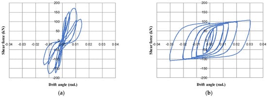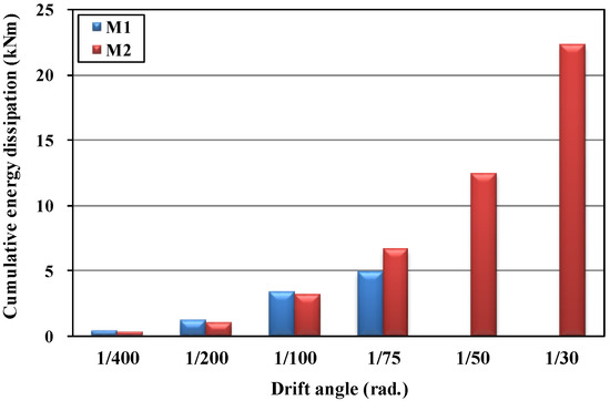 Figure 16 shows the cumulative energy dissipation area, which is calculated as described in Section 3.3, of M1 and M2 for each cycle. M1 and M2 showed a similar cumulative energy dissipation up to a drift angle of 1% and the energy dissipation ability of M1 became lower than that of M2 at a drift angle of 1.3%. Then, where M1 showed structural failure owing to shear and bond cracks, the energy dissipation capacity of M2 improved greatly as the drift angle increased. For example, at a drift angle of approximately 3%, the cumulative energy dissipation capacity of M2 was around 4.5 times higher than that of M1. These experimental results confirmed that the proposed R-type damper has high energy dissipation capacity even when applied to structural members.