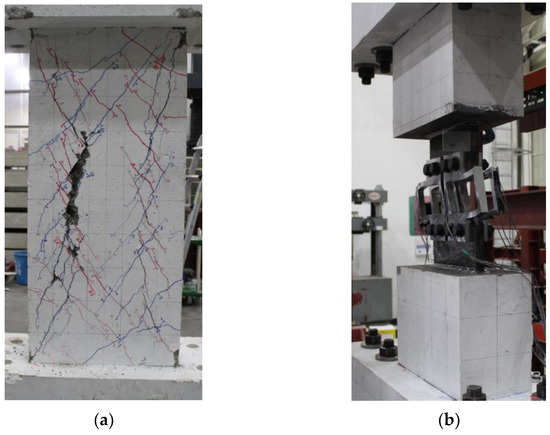 As shown in Figure 14a, which is the view after M1 failure, the shear and bond cracks are more prominent than the flexural cracks. In M1, flexural and shear cracks were observed in the 1/400 cycle. As the drift angle increased further, the number and width of shear cracks increased. Shear and bond cracks developed significantly with a load of 171.4 kN at a drift angle of 0.0088 rad in the 1/100 cycle, resulting in brittle shear-bond failure. This is because the short shear span ratio of the coupling beam is very vulnerable to shear and bond due to lateral forces such as earthquake loads.