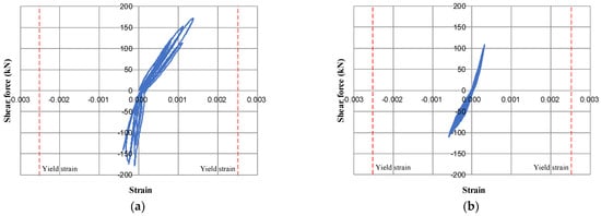 Figure 13 shows the shear force vs. drift angle relationships obtained from the Phase II test for evaluating the applicability of the proposed R-type damper. Figure 14a shows that in Specimen M1 without a damper, the RC member resisted the entire external shear force and this resulted in brittle fracture owing to shear and bond cracks. As shown in Table 3, M1 had a maximum load of 171.4 kN at a drift angle of 0.0088 rad in the 1/100 cycle in the positive direction and −177.8 kN at a drift angle of −0.01 rad in the −1/100 cycle in the negative direction. In the 1/75 cycle, the test was terminated as the applied load decreased to approximately 65% of the maximum load. As shown in Figure 15a, the longitudinal reinforcement of M1 did not yield.