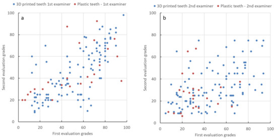 First vs. second preparation evaluation grades: (a) first examiner; (b) second examiner.