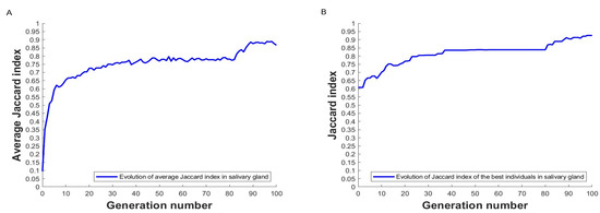 (A) Evolution of the average Jaccard index by generation. (B) Evolution of the Jaccard index for the best individual by generation, for segmented salivary gland imaging.