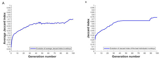 During the first generations, it can also be observed a difference between the mean and best Jaccard indexes in Figure 4A,B, respectively. While the best solution in the initial population has a Jaccard index of , the mean of the Jaccard indexes on the same population is . This difference diminishes as the generations evolve, being the best individual Jaccard index close to the average in generation 18.