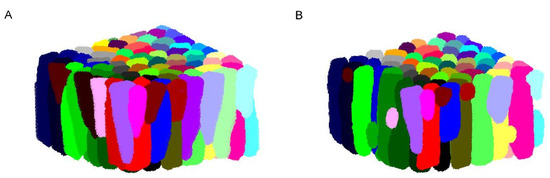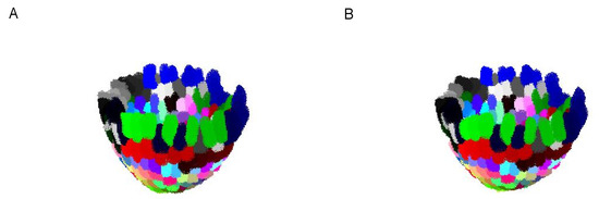 From the best individual genotype in Table 3, the graphical representation of its segmentation has been depicted in Figure 5B, where it has been compared with the manually obtained segmentation (Figure 5A). In this comparison, differences are much more evident than the differences presented by the segmentation of the salivary gland in Figure 3. A lack of compactness is especially observed in the segmentation of the algorithm. This is possibly due to the either the parameter F_pressure, since the volumes of the cells are similar, but they do not seem to have been sufficiently expanded. Furthermore, the height of some cells is not the same in the best individual segmentation and in the manual segmentation, and some cells are missing in the best individual segmentation. Both problems may be related to the difference in the D_0 parameter, which could cause that some pixels are not clustered correctly.