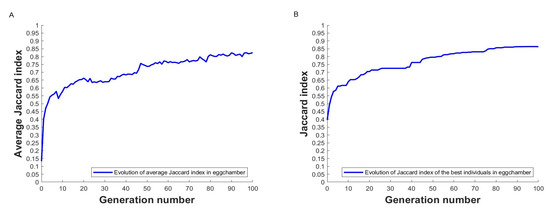 (A) Evolution of the average Jaccard index by generation. (B) Evolution of the Jaccard index for the best individual by generation, for segmented egg chamber imaging.