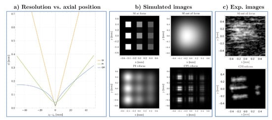 (a) shows the resolution limits, as a function of the longitudinal position, of the image of a double-slit mask with center-to-center distance d equal to twice the slit width; here, CPI outperforms both conventional imaging and standard PI with 3 × 3 directional resolution. The evident asymmetry of the CPI curve is due to the existence of two planes in which the object is focused: one at and one at (see [16]). Plots in (b) show a result of a simulation: the target is moved from the focused plane (top left) to an out-of-focus plane (top right). Starting from this position, we show the results of PI refocusing with 3 × 3 directional resolution (bottom left) and the CPI refocusing (bottom right); (c) shows the results of an experiment [16] in which the standard image of a triple slit was completely blurred (top), while the image obtained by CPI (bottom) was made fully visible by exploiting information on light direction. Plots in (c) are reproduced with the permission from Ref. [16], copyright American Physical Society, 2017.