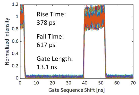 A relevant part of the speedup that we are seeking is determined by replacing commercial high-resolution sensors, like scientific CMOS and EMCCD cameras, with sensors based on cutting-edge technology such as single-photon avalanche diode (SPAD) arrays. A SPAD is basically a photodiode which is reversely biased above its breakdown voltage, so that a single photon which impinges onto its photosensitive area can create an electron–hole pair, triggering in turn an avalanche of secondary carriers and developing a large current on a very short timescale (picoseconds) [17,18]. This operation regime is known as Geiger mode. The SPAD output voltage is sensed by an electronic circuit and directly converted into a digital signal, further processed to store the binary information that a photon arrived, and/or the photon time of arrival. In essence, a SPAD can be seen as a photon-to-digital conversion device with exquisite temporal precision. SPADs can also be gated, in order to be sensitive only within temporal windows as short as a few nanoseconds, as shown in Figure 3. Individual SPADs can nowadays be used as the building blocks of large arrays, with each pixel circuit containing both the SPAD and the immediate photon processing logic and interconnect. Several CMOS processes are readily available and allow for tailoring both the key SPAD performance metrics and the overall sensor or imager architecture [43,44]. Sensitivity and fill-factor have for some time lagged behind those of their scientific CMOS or EMCCD counterparts but have been substantially catching up in recent years.