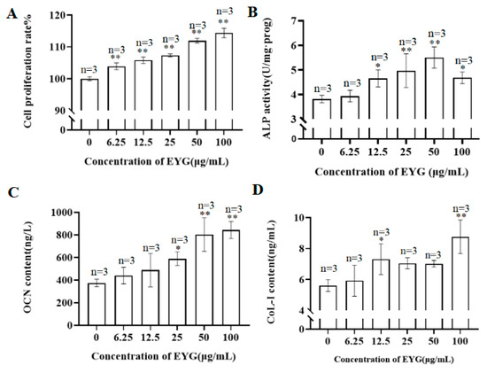 Effect of EYG on cell proliferation (A), cell ALP activity (B), supernatant OCN on day 14 (C) and supernatant COL-I on day 7 (D) content of MC3T3-E1 cells. MC3T3-E1 cells were treated with various concentrations of EYG (0, 6.25, 12.5, 25, 50, 100 μg/mL). Data were expressed as mean ± SEM and the number of replicates was 3 (n = 3). Multiple comparisons were done using one way ANOVA analysis. * p < 0.05, ** p < 0.01 versus control.