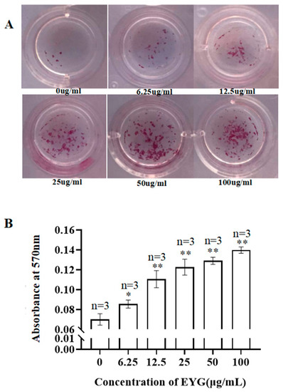 After the treatment with different concentrations of EYG (0, 6.25, 12.5, 25, 50, 100 µg/mL), the proliferation rate of MC3T3-E1 cells increased in a dose-dependent manner. When the concentration of EYG was 100 µg/mL, the proliferation rate of MC3T3-E1 cells significantly increased to 114.37%, indicating that EYG could significantly promote the proliferation of MC3T3-E1 cells without toxic side effects (Figure 1A).