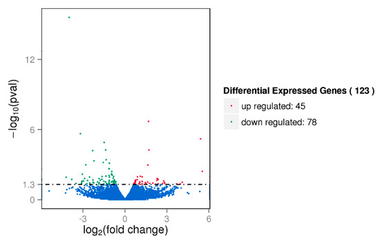 Volcano plot of distribution trends for differentially expressed genes with 50 µg/mL concentrations of EYG and control groups. Each dot represents one gene. Red dots represent upregulated genes and green dots represent downregulated genes. Blue dots represent genes with no differential expression. There are 123 differentially expressed genes in total, including 45 upregulated genes and 78 downregulated genes.
