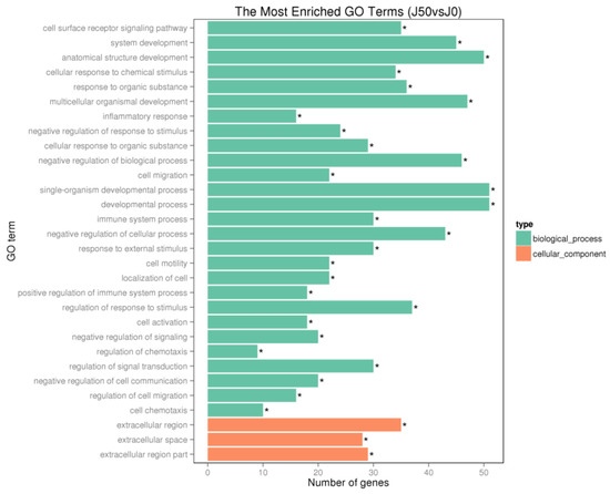 GO analysis of DEGs between 50 µg/mL concentrations of EYG group and control group. The ordinate was the GO term of enrichment, and the abscissa was the number of different genes in the term. Different colors were used to distinguish biological processes, cell components and molecular functions. * GO term was significantly enriched.