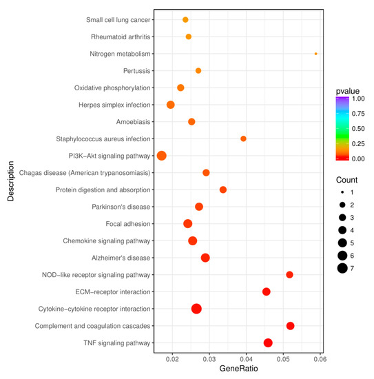 KEGG enrichment analysis was performed for genes with different expression levels. Scatter plot is a graphical representation of KEGG enrichment analysis results. The 20 pathways with the most significant enrichment were selected (Figure 5). We found that gene expression in several pathways was significantly different after the treatment of EYG including TNF signaling pathway, complement and coagulation cascades, ECM–receptor interaction, focal adhesion, protein digestion and absorption.