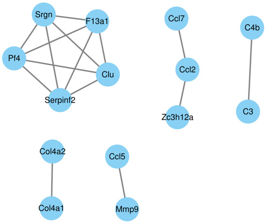 The PPI network with 14 nodes and 15 interaction pairs was constructed (Figure 6). Pathway analysis showed that the complement and coagulation cascades were the most enriched signaling pathways, such as TNF signaling pathway, ECM–receptor interaction were also enriched to varying degrees.
