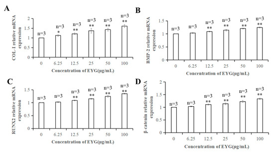 Gene relative expressions of COL-I (A), BMP2 (B), Runx2 (C) and β-catenin (D) by qRT-PCR analysis. MC3T3-E1 cells were treated with various concentrations of EYG. EYG significantly increased the above key factors of MC3T3-E1 osteoblast. Data were expressed as mean ± SEM and the number of replicates was 3 (n = 3). Multiple comparisons were done using one way ANOVA analysis. * p < 0.05, ** p < 0.01 versus control.