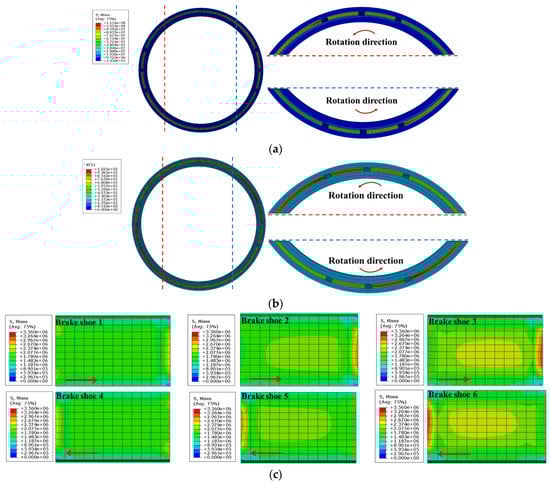 Figure 11a,b show that at the typical braking time of 4.380 s during emergency braking, the maximum equivalent stress and temperature at the contact interfaces between the brake disc and the brake shoe were 115 MPa and 102.1 °C, respectively, and were both located at the average friction radius of the brake disc. Meanwhile, the equivalent stress at the average friction radius of the brake disc was higher as compared to that at both sides of the brake disc. Along the anti-clockwise rotation direction of the brake disc, the temperature and equivalent stress at each contact interface of the brake disc both increased gradually, and reached maximum values at the contact interfaces of brake shoes 3 and 6, which can be attributed to the poor thermal convection effect and the superposition effect of frictional thermal stress between the brake disc and the air. However, due to the long distances between brake shoes 3 and 4 and between brake shoes 6 and 1, the long-term heat exchange between the brake disc and the air causes decreases in the equivalent stress and temperature along the rotation direction of the brake disc [3,13]. Figure 11c shows increases in the equivalent stress level from brake shoe 1 to brake shoe 3 and from brake shoe 4 to brake shoe 6, respectively, which indicates the accumulation effect of the equivalent stress of the frictional surface of the brake shoe along the rotation direction of the brake disc. The maximum equivalent stress of each brake shoe was located at the sliding-out side of the brake disc; the brake shoe exhibited a higher equivalent stress level in the middle as compared to the periphery. Figure 11d shows that the contact surface of each brake shoe presents a near-rectangular high temperature distribution zone at one side and exhibited the highest temperature at the sliding-out side of the brake disc due to the cumulative effect of friction heat. In order to reveal the stress distribution difference of the brake shoe at the sliding-in and sliding-out sides of brake disc, we chose two nodes on the contact interface of the brake shoe (Figure 12) and obtained evolution curves of the equivalent stress of both nodes during emergency braking (Figure 12b). Figure 12 shows the larger equivalent stress of the brake shoe at the sliding-out side of the brake disc at the initial stage of emergency braking. Meanwhile, the equivalent stress of the brake shoe decreased with increasing emergency braking time; the equivalent stress level at the sliding-in side of the brake disc was larger as compared to the sliding-out side at the emergency braking time of 2.95 s.