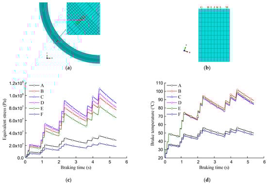 In order to quantitatively reveal the evolution characteristics of the thermal stresses of the brake disc and the brake shoe during emergency braking, and based on the thermal stress accumulation effect along the rotation direction of the brake disc, we chose radial reference nodes of the brake disc and brake shoe 6, as shown in Figure 13a,b. The reference node for the brake disc during emergency braking consisted of the node corresponding to the maximum equivalent stress. Figure 13c shows that equivalent stresses of points C and D near the average friction radius of the contact surface of the brake disc exhibited larger values, and the equivalent stress decreased gradually along the radial direction, which coincided with distribution laws of equivalent stress at the contact surface of the brake disc, outlined in Section 3.3, i.e., the high equivalent stress in the middle and the decreasing trend towards both sides. Figure 13d shows that the temperatures of reference points B, C, D and E near the average friction radius of the brake disc were larger than the temperatures of reference points A and F at the contact edge; the temperatures of reference points B and E were larger as compared to the temperatures of reference points C and D. Therefore, the temperature of the brake disc presented a slight increase and then a decrease along the radial direction from the average friction radius towards both sides of the brake disc. Figure 13c,d show the similar change laws of equivalent stress and temperature of the brake disc. As the reference node of the contact surface of the brake disc passed through three pairs of brake shoes on one side of brake disc, the equivalent stress and temperature both exhibited three rapid increases and two slight decreases. When the reference point of the contact surface of the brake disc passed from one side to the other side of the brake shoe, the equivalent stress and temperature both decreased continuously, which is attributed to the heat convection between the brake disc and the air. It can be clearly seen in Figure 13e that the evolution curves of the equivalent stresses of various reference nodes of the brake shoe indicate that the contact surface of the brake shoe presented high equivalent stresses in the middle locations (reference points H–L) and low equivalent stresses at the edge locations (reference points G and M). The equivalent stress reached the largest values at points I and J, and decreased in the order of reference points H, K and L. The overall change trends of the equivalent stresses of the brake shoe and the brake disc were similar, whereas the vibration effect caused the continuous fluctuation of the equivalent stress of the brake shoe during emergency braking. It can be obviously observed in Figure 13f that the reference point H of the brake shoe exhibited the highest temperature, and the contact surface of the brake shoe presented the higher temperature in the middle location as compared to the edge locations. Figure 13e,f show that the maximum equivalent stresses and temperature of various nodes were not located at the end of emergency braking due to the cumulative effect of frictional heat during emergency braking. However, the small relative sliding speed between the brake disc and the brake shoe at the late stage of emergency braking caused less friction heat generation at the contact surface as compared to the heat convection among the brake disc, brake shoe and the air, which caused both decreases in the equivalent stress and temperature of the brake shoe at the late stage of emergency braking. Figure 13g shows that the equivalent stress of the brake shoe was obviously smaller as compared to that of the brake disc, and the maximum temperature of the contact surface of the brake disc was slightly larger than that of the brake shoe.
