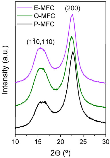 The powder X-ray diffraction (XRD) pattern of the three MFCs show the typical reflections of crystalline cellulose Iβ at 2θ = 22.6° and 15.8°, which correspond to the (200), (110) and (10) planes, respectively (Figure 2) [47]. The latter two reflections are superimposed. The crystallinity indices, CI, calculated from the diffractograms, were 84% (P-MFC), 79% (E-MFC) and 76% (O-MFC). These values suggest that P-MFC is slightly more crystalline than the other two MFC samples. Thus, although the process used to obtain MFC was the same, crystallinity also depends on the initial raw material [43].