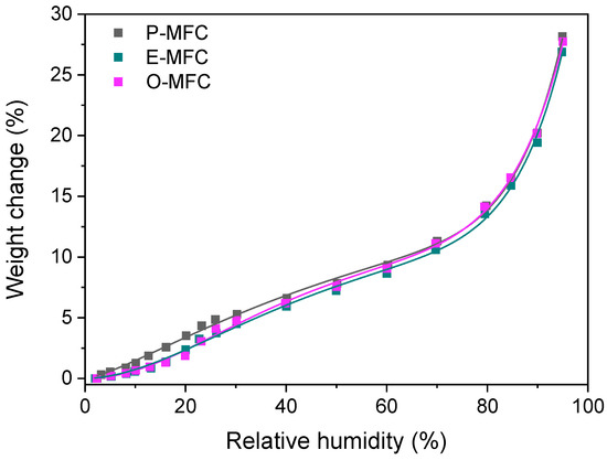 Water vapor sorption isotherms were collected to characterize the wetting behavior of the three different MFC films (Figure 3). The isotherms are similar for all samples showing a maximum water sorption of 26–28 wt% at 95% relative humidity. This value is comparable to other MFC obtained by microfluidification [57]. At the low relative humidity range up to 30%, it appears that P-MFC adsorbs slightly more water than the other two MFC films. This range is dominated by the formation of an initial water mono- and multilayer on the sorbent surface and therefore, is typically taken as a measure of a material’s hydrophilicity [58].
